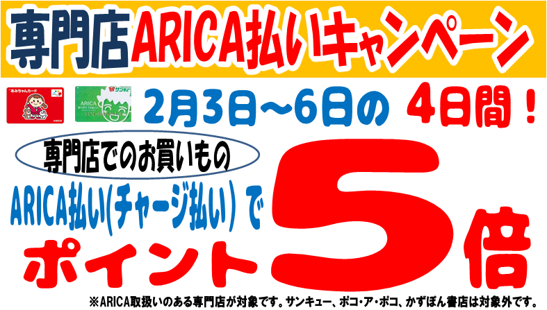 【専門店ARICA払いキャンペーン】2/3(火)~2/6(金)の4日間★ポイント5倍進呈!!