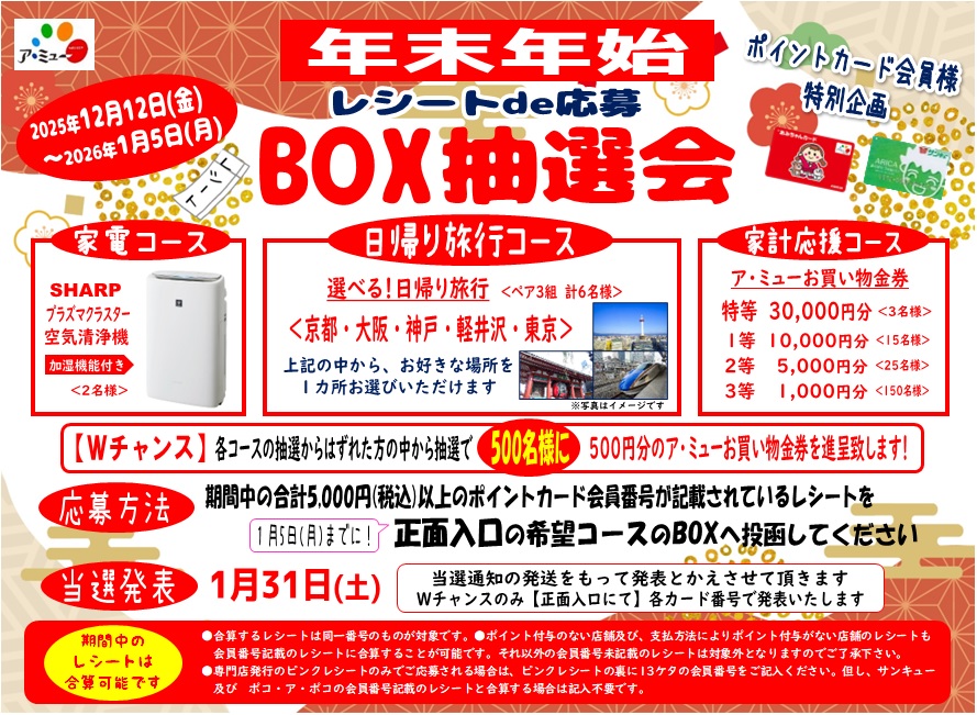 日帰り旅行や空気清浄機、金券3万円分など、豪華賞品が当たるチャンスです♬どしどし!ご応募ください!!