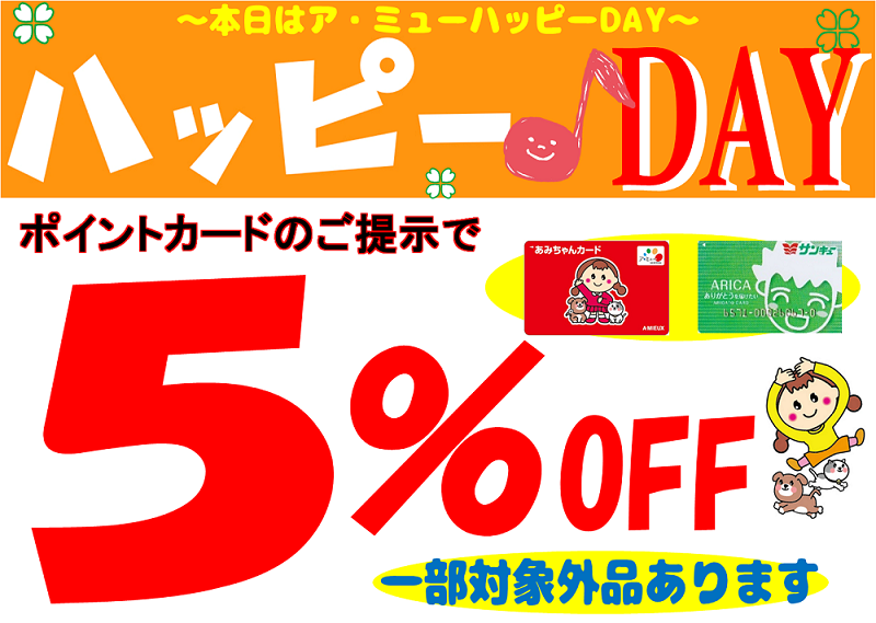 10月15日(水)はARICAあみちゃんカード・ありがとうカードのご提示で5%OFFの『ハッピーDAY』